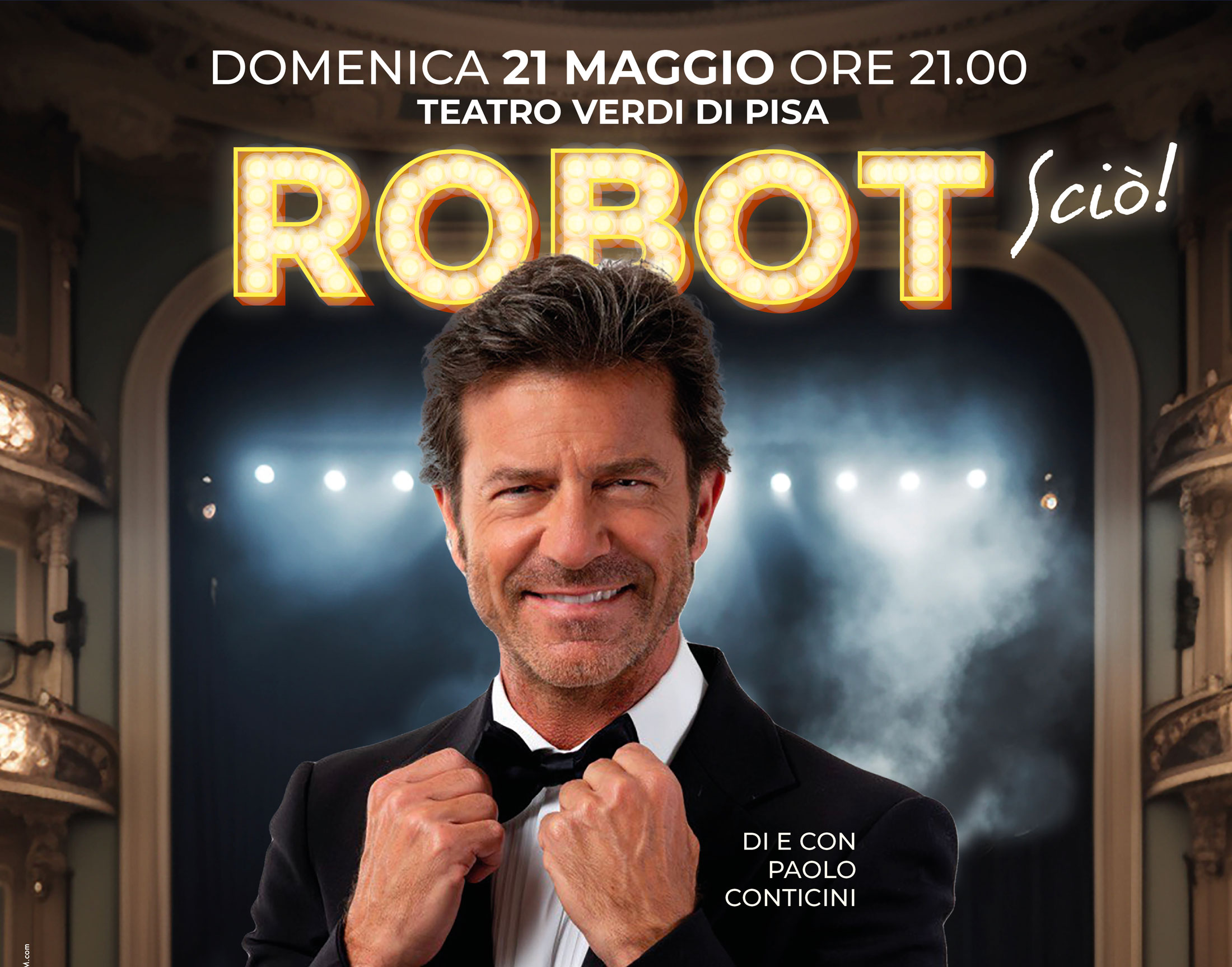 Il Festival della Robotica, edizione 2023, chiude la tre giorni di eventi in crescendo, chiamando il pubblico al Teatro Verdi di Pisa, domenica 21 maggio ore 21.00 per lo spettacolo ‘Robot Sciò!’ con l’attore e conduttore Paolo Conticini. Una serata che vuole essere una grande festa per accompagnare al meglio la chiusura del Festival. Una serata ancora più importante perché ha un intento benefico: l’incasso dei biglietti sarà infatti devoluto alla Fondazione Arpa, la ONLUS nata per iniziativa del Professor Franco Mosca con la finalità di promuovere la ricerca e la formazione in vari campi della Sanità.